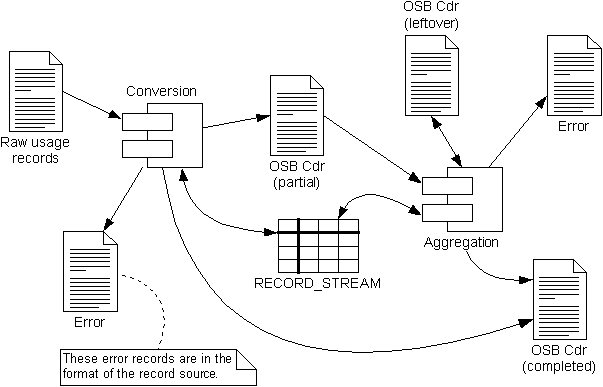 Conversion is the process that converts the usage records from the format of the network elements into the OSB internal Cdr format. Aggregation is responsible to assemble partial records. Diagram shows the input and output record streams of both processes: